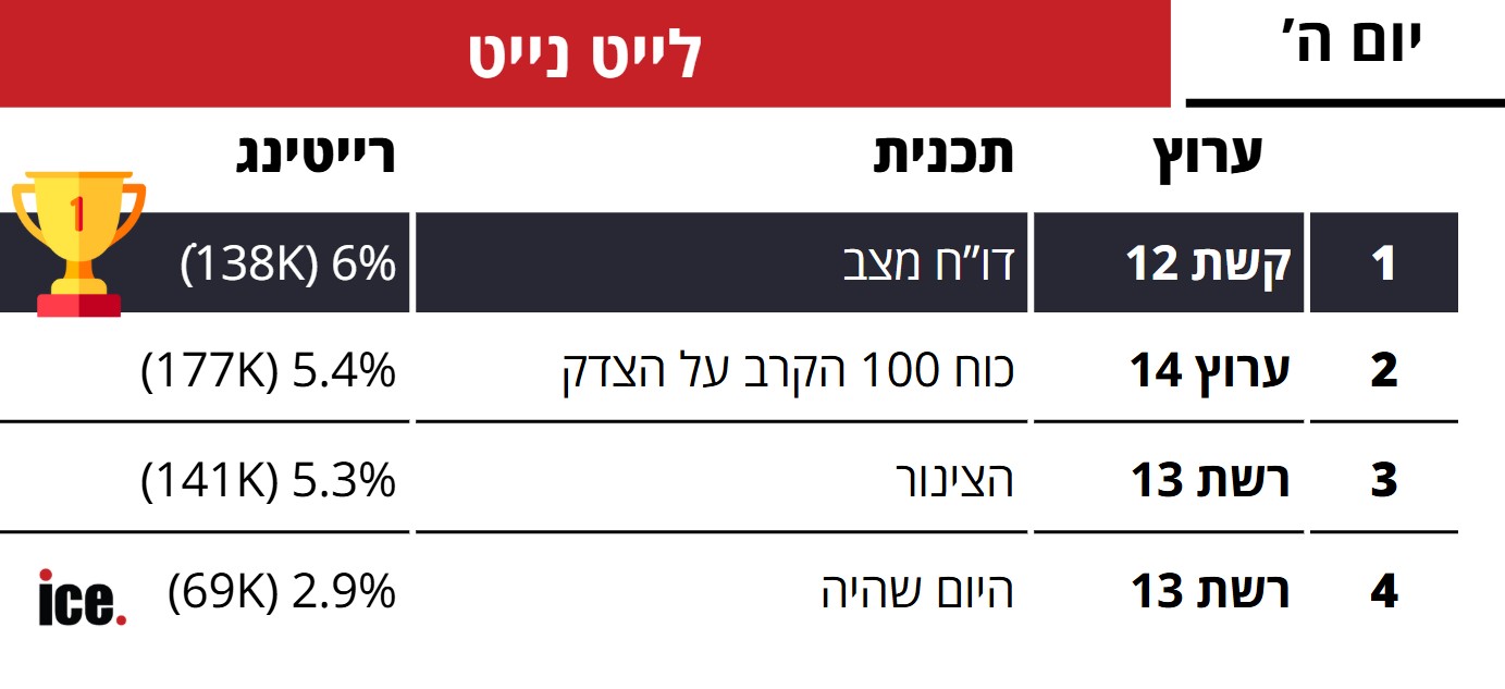בגזרת הלייט נייט, במקום הראשון התוכנית דו"ח מצב בקשת 12 עם 6.1%. אחריה כוח 100 הקרב על הצדק בערוץ 14 עם 5.4%. הצינור ברשת 13 גרפה 5.4% והיום שהיה גם כן ברשת 13 עם 2.9%.