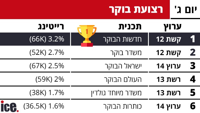 ברצועת הבוקר התחרות הייתה הצמודה ביותר מבין כל רצועות השידור. "חדשות הבוקר" עם נסלי ברדה בקשת 12 הובילה עם 3.2% ו-66 אלף צופים, ממש לפני "משדר בוקר" עם יואב לימור באותה רשת עם 2.7% ו-52 אלף צופים. "ישראל הבוקר" בערוץ 14 תפסה את המקום השלישי עם 2.5% אך עם מספר צופים מעט גבוה יותר - 67 אלף. "העולם הבוקר" ברשת 13 הגיעה ל-2% ו-59 אלף צופים, ואחריה "על הבוקר" בערוץ 14 עם 1.9% ו-49 אלף צופים. "משדר מיוחד גולדין" ברשת 13 סגר את רצועת הבוקר במקום האחרון עם 1.7% ו-38 אלף צופים.