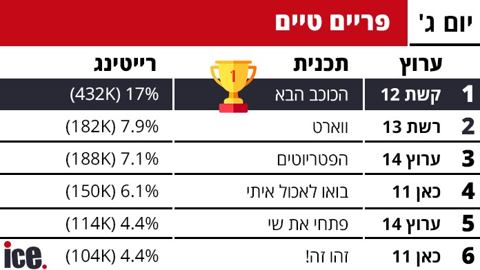 "הכוכב הבא" בקשת 12 המשיך לגרוף צופים ברצועת הפריים טיים המבוקשת עם רייטינג עצום של 17% ו-432 אלף צופים. במקום השני הגיע "ווארט" ברשת 13 עם 7.9% ו-182 אלף צופים, ואחריו "הפטריוטים" בערוץ 14 ללא ינון מגל