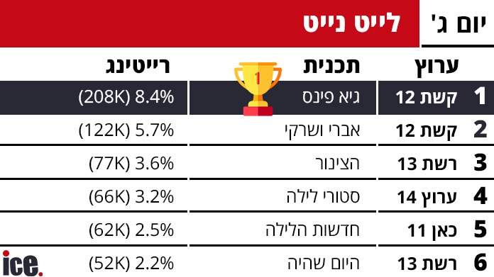 ברצועת הלילה המאוחרת המשיך "גיא פינס" בקשת 12 לשלוט בביטחון עם 8.4% ו-208 אלף צופים. "אברי ושרקי" באותה רשת השיגו 5.7% ו-122 אלף צופים, ושמרו על המקום השני. "הצינור" ברשת 13 הגיע ל-3.6% ו-77 אלף צופים, ואחריו במרווח צמוד "סטורי לילה" בחדשות 14 עם 3.2% ו-66 אלף צופים. "חדשות הלילה" בכאן 11 תפסה 2.5% ו-62 אלף צופים, בעוד ש"היום שהיה" ברשת 13 סגרה את הרצועה עם 2.2% ו-52 אלף צופים בלבד - המקום האחרון ברצועה התחרותית.
