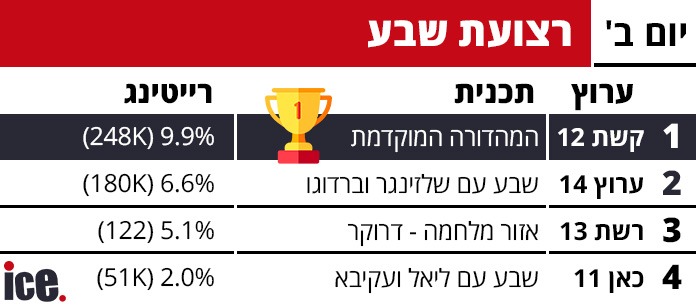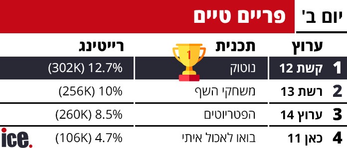 בשעות הפריים טיים היוקרתיות, קשת 12 חוגגת עם "נוטוק" שמוביל בראש עם 12.7% רייטינג ו-302 אלף צופים. רשת 13 נמצאת צמוד מאחור עם "משחקי השף" שרשם 10% ו-256 אלף צופים. ערוץ 14 מציג ביצועים חזקים עם "הפטריוטים" ש-8.5% ו-259 אלף צופים. ערוץ הספורט רשם 5.2% ו-98 אלף צופים בשידור הדרבי, ואילו כאן 11 סגרה את הרצועה עם "בואו לאכול איתי" שהשיג 4.6% ו-71 אלף צופים.