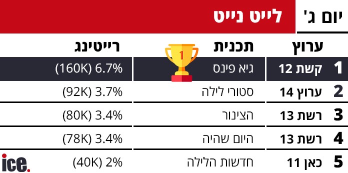 ברצועת הלייט נייט, "גיא פינס" בקשת 12 הוביל עם 6.7% ו-160 אלף צופים, ובערוץ 14 "סטורי לילה" הגיע ל-3.7% עם 92 אלף צופים. ברשת 13 נרשמה תוצאה משותפת: "הצינור" ו"היום שהיה" רשמו כל אחד 3.4% עם 80 ו-78 אלף צופים בהתאמה, ובכאן 11 "חדשות הלילה" סגרו את הערב עם 2% ו-40 אלף צופים.