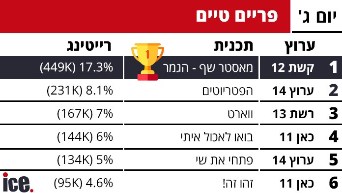 בגמר עונתי מרהיב, "מאסטר שף" בקשת 12 הגיע לשיא נאה של 17.3% רייטינג עם 449 אלף צופים, והוביל את רצועת הפריים טיים בהפרש ניכר מהמתחרים ועדיין לא מדובר באחת התוצאות היותר גבוהות מצד הריאליטי.
