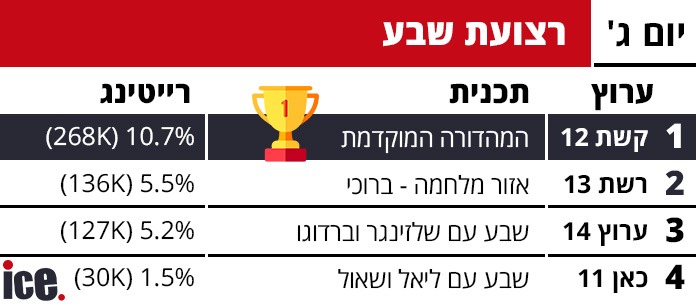 ברצועת החדשות, חדשות 12 שלטו באופן גורף עם 13.5% רייטינג ו-339 אלף צופים, תוצאה שמרחיקה אותם משמעותית מכל המתחרים. חדשות 14 תפסו את המקום השני עם 7.2% ו-172 אלף צופים, חדשות 13 הגיעו למקום השלישי עם 5.3% ו-138 אלף צופים, וחדשות 11 סיימו את רצועת החדשות עם 3.5% ו-78 אלף צופים בלבד.