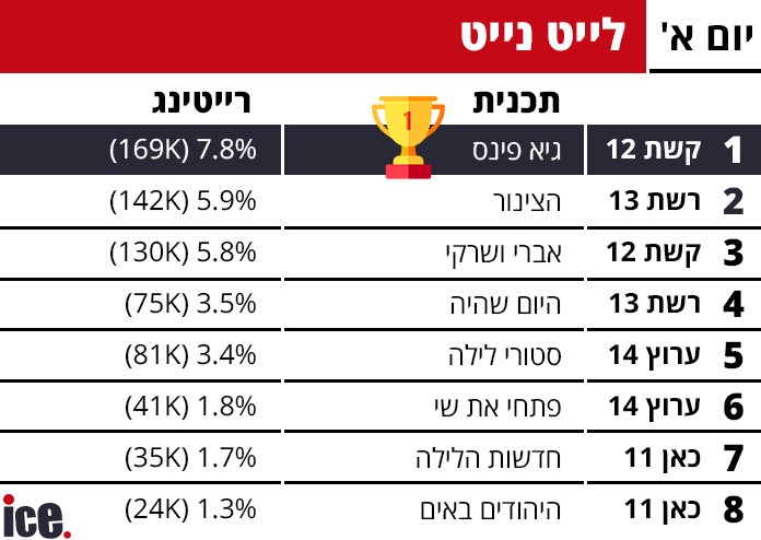 "גיא פינס" בקשת 12 מוביל את רצועת הלייט המאוחרת עם 7.8% רייטינג ו-169 אלף צופים. במקום השני "הצינור" ברשת 13 עם 5.9% ו-142 אלף צופים, ואחריו "אברי ושרקי" בקשת 12 עם 5.8% ו-130 אלף צופים. "היום שהיה" ברשת 13 עם 3.5% ו-75 אלף צופים, "סטורי לילה" בערוץ 14 עם 3.4% ו-81 אלף צופים, "פתחי את שי" (שידור חוזר) בערוץ 14 עם 1.8% ו-41 אלף צופים, "חדשות הלילה" בכאן 11 עם 1.7% ו-35 אלף צופים, ו"היהודים באים" בכאן 11 סוגר את הרצועה עם 1.3% ו-24 אלף צופים בלבד.