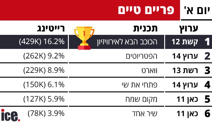 "הכוכב הבא לאירוויזיון" בקשת 12 מוביל בבירור את רצועת הפריים טיים עם 16.2% רייטינג ו-429 אלף צופים. במקום השני "הפטריוטים" בערוץ 14 עם 9.2% ו-262 אלף צופים, ואחריו "ווארט" ברשת 13 עם 8.9% ו-229 אלף צופים. "פתחי את שי" בערוץ 14 מגיע ל-6.1% ו-150 אלף צופים, "מקום שמח" בכאן 11 עם 5.9% ו-127 אלף צופים, ו"שיר אחד" בכאן 11 סוגר את הרצועה עם 3.9% ו-78 אלף צופים.