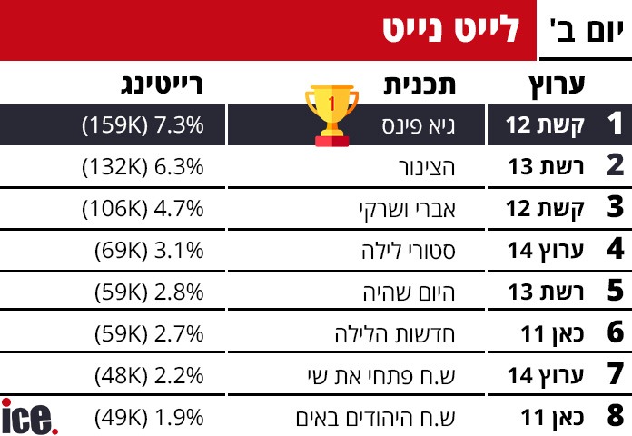 "גיא פינס" בקשת 12 מוביל את רצועת הלייט המאוחרת עם 7.3% רייטינג ו-159 אלף צופים. במקום השני "הצינור" ברשת 13 עם 6.3% ו-132 אלף צופים, ואחריו "אברי ושרקי" בקשת 12 עם 4.7% ו-106 אלף צופים. "סטורי לילה" בערוץ 14 עם 3.1% ו-69 אלף צופים, "היום שהיה" ברשת 13 עם 2.8% ו-59 אלף צופים, "חדשות הלילה" בכאן 11 עם 2.7% ו-59 אלף צופים, "פתחי את שי" (שידור חוזר) בערוץ 14 עם 2.2% ו-48 אלף צופים, ו"שידור חוזר היהודים באים" בכאן 11 סוגר את הרצועה עם 1.9% ו-49 אלף צופים בלבד.