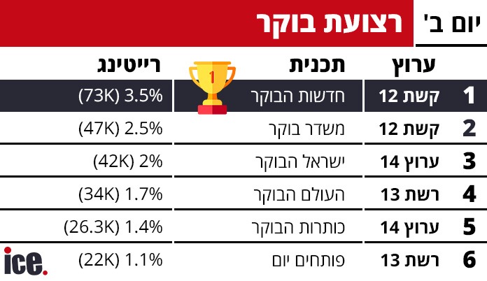 "חדשות הבוקר" בקשת 12 מובילה את רצועת הבוקר המוקדמת עם 3.5% רייטינג ו-73 אלף צופים. "משדר בוקר" עם יואב לימור באותה רשת ממשיך את ההובלה עם 2.5% ו-47 אלף צופים. במקום השני "ישראל הבוקר" בערוץ 14 עם 2.0% ו-42 אלף צופים, ואחריו "העולם הבוקר" ברשת 13 עם 1.7% ו-34 אלף צופים. "על הבוקר" עם עדן הראל ועודד מנשה בערוץ 14 עם 1.7% ו-32 אלף צופים, ו"פותחים יום" ברשת 13 סוגר את הרצועה עם 1.1% ו-22 אלף צופים בלבד.