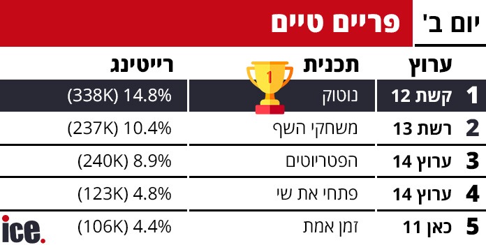 "נוטוק" בקשת 12 מוביל בבירור את רצועת הפריים טיים עם 14.8% רייטינג ו-338 אלף צופים - מספרים המעידים על הצלחה גדולה לתכנית. במקום השני "משחקי השף" ברשת 13 עם 10.4% ו-237 אלף צופים, ואחריו "הפטריוטים" בערוץ 14 עם 8.9% ו-240 אלף צופים. "פתחי את שי" בערוץ 14 מגיע ל-4.8% ו-123 אלף צופים, ו"זמן אמת" בכאן 11 סוגר את הרצועה עם 4.4% ו-106 אלף צופים.