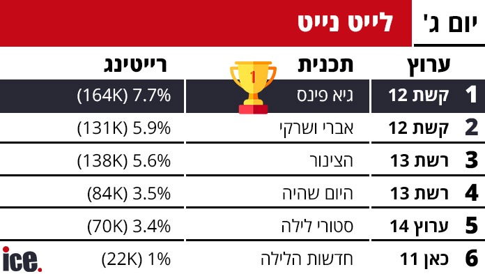 שוב מהפך ברצועת הלייט נייט: גיא פינס מחזיר לעצמו את ההובלה, הצינור ללא גיא לרר נותר מאחור, וגם למרות נתון נמוך במיוחד של הכוכב הבא לאירוויזיון, הפטריוטים ווארט ממשיכים לא לדגדג את קשת 12