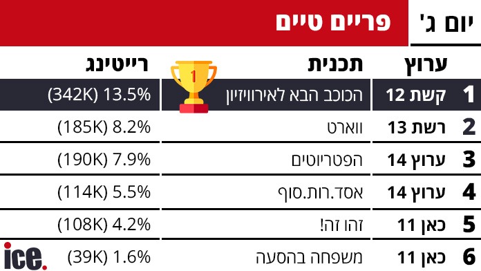 אמש המשיך הקרב על הרייטינג, כאשר בפריים טיים הכוכב הבא לאירוויזיון נחלשת אך עדיין משאירה אבק למתחרות עם נתון של 13.5% ו-342 אלף צופים. ווארט של רשת 13 במקום השני עם 8.2% ו-185 אלף צופים. הפטריוטים עם ינון מגל והפאנליסטים במקום השלישי עם 7.9% ו-190 אלף צופים. זהו זה של כאן 11 במקום האחרון רחוקה מהיתר.