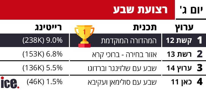 את רצועת שבע מובילה קשת 12 כאשר 9% ו-238 אלף אנשים צפו במהדורה המוקדמת עם גדעון אוקו. אזור בחירה ברשת 13 עם ברוכי קרא במקום השני עם 6.8% ו-153 אלף צופים. שבע עם שליזנגר וברדוגו רק במקום השלישי 5.5% בלבד ו-136 אלף צופים. שבע בכאן 11 הרחק מאחור.