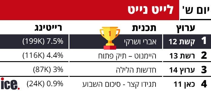 גם ברצועת הלייט נייט, קשת 12 המשיכה את השליטה עם התוכנית "אברי ושרקי" שרשמה 7.5% ו-199 אלף צופים. במקום השני הגיעה רשת 13 עם "היימנוט - תיק פתוח" שרשם 4.4% ו-116 אלף צופים. ערוץ 14 עם "חדשות הלילה" תפס את המקום השלישי עם 3% ו-87 אלף צופים, בעוד כאן 11 סגרה את הרצועה עם "תגידו קצר - סיכום השבוע" שרשם 0.9% זניח עם 24 אלף צופים בלבד.