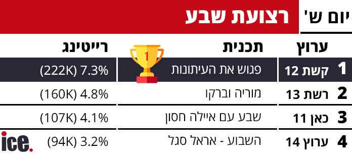 חדשות 12 בקשת המשיכה לשלוט ברייטינג עם 11.9% נתח צפייה שמתורגם ל-351 אלף צופים מרותקים, פער משמעותי מול המתחרות. במקום השני הגיעה חדשות 13 ברשת עם 6.1% ו-177 אלף צופים, בעוד ערוץ 14 תפס את המקום השלישי עם 4.5% רייטינג ו-113 אלף צופים. כאן 11 סגרה את רצועת החדשות עם 4.1% ו-118 אלף צופים, מעט פחות מערוץ 14 באחוזים אך במספר צופים דומה.