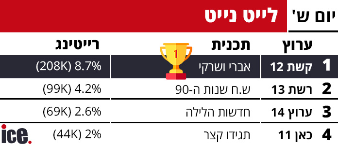 ברצועת הלייט נייט המאוחרת, קשת 12 המשיכה לשלוט עם "אברי ושרקי" שרשמה 8.7% רייטינג ו-208 אלף צופים. רשת 13 הציגה את "ש.ח שנות ה-90" עם 4.2% ו-99 אלף צופים. ערוץ 14 עם "חדשות הלילה" רשם 2.6% ו-69 אלף צופים, בעוד כאן 11 סגרה עם "תגידו קצר" שמשך רק 2% ו-44 אלף צופים.