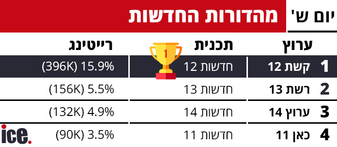 קשת 12 שולטת בערב שבת: "הכוכב הבא" מוביל עם 17.3%, מהדורת החדשות מובילה בפער. רשת 13 הגיעה למקום השני עם "משחקי השף" שרשמה 11.3% ו-286 אלף צופים - תוצאה טובה מבחינתה והרבה מעל הפטריוטים בערוץ 14