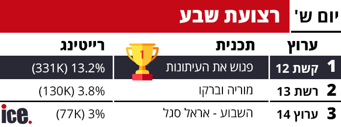 ברצועת 19:00, קשת 12 המשיכה את ההובלה עם "פגוש את העיתונות" שרשמה 13.2% רייטינג ו-331 אלף צופים - תוצאה מובהקת שמבססת את מעמד התוכנית כאחת המצליחות של הערב. רשת 13 הציגה את "מוריה וברקו שבת" (מוריה אסרף ושי גולדן) עם 3.8% ו-130 אלף צופים, בעוד ערוץ 14 סגר את הרצועה עם "השבוע" (אראל סגל) שרשם 3% ו-77 אלף צופים בלבד.