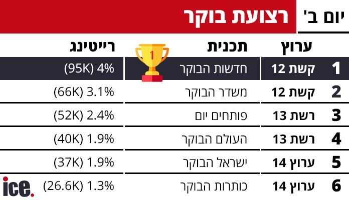 "חדשות הבוקר" בקשת 12 בראש רצועת הבוקר עם 4% ו-95 אלף צופים. במקום השני "משדר בוקר" עם יואב לימור בקשת 12 עם 3.1% ו-66 אלף צופים. "פותחים יום" ברשת 13 רשם 2.4% ו-52 אלף צופים. שתי תוכניות חולקות את המקום הרביעי עם 1.9% - "העולם הבוקר" ברשת 13 עם 40 אלף צופים ו"ישראל הבוקר" בערוץ 14 עם 37 אלף צופים. בתחתית הרצועה "על הבוקר" עם עדן הראל ועודד מנשה בערוץ 14 עם 1.2% ו-27 אלף צופים.