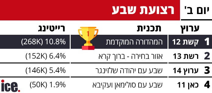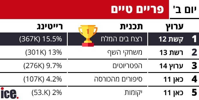 "רצח בים המלח" בקשת 12 מוביל את רצועת הפריים טיים עם תוצאה חזקה של 15.5% ו-367 אלף צופים. במקום השני "משחקי השף" ברשת 13 עם ביצועים מרשימים של 13% ו-301 אלף צופים. "הפטריוטים" בערוץ 14 במקום השלישי עם 9.7% ו-276 אלף צופים. "סיפורים מהכורסה" בכאן 11 רשם 4.2% ו-107 אלף צופים, ובתחתית הטבלה "יקומות" באותו ערוץ עם 2% ו-53 אלף צופים.