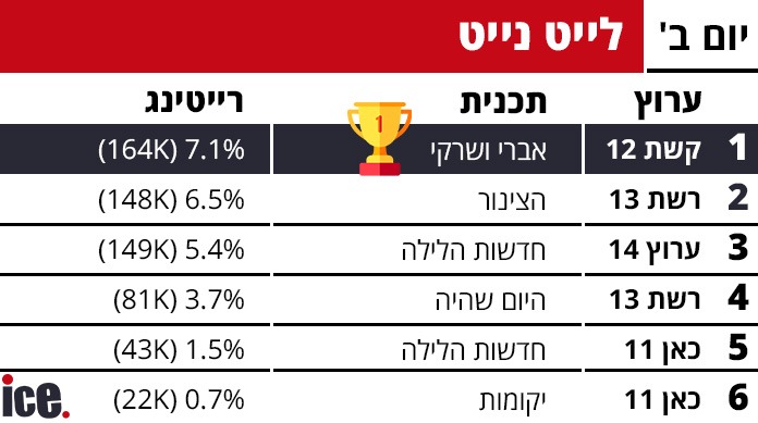 ברצועת הלייט נייט, "אברי ושרקי" בקשת 12 בראש עם 7.1% ו-164 אלף צופים. במקום השני "הצינור" ברשת 13 עם 6.5% ו-148 אלף צופים, ואחריו "חדשות הלילה" בערוץ 14 עם 5.4% ו-149 אלף צופים. "היום שהיה" ברשת 13 רשם 3.7% ו-81 אלף צופים, "חדשות הלילה" בכאן 11 עם 1.5% ו-43 אלף צופים, ובתחתית "יקומות" בכאן 11 עם 0.7% ו-22 אלף צופים בלבד.