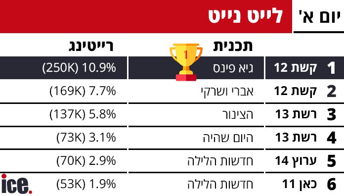 גם בגזרת הלייט נייט אין חדש תחת השמש: קשת 12 מנצחים גם פה, כאשר 10.9% ו-248 אלף צופים העדיפו את גיא פינס על פני גיא לרר והצינור עם 5.8% ו-136 אלף צופים. פתחי ושי בערוץ 14 במקום השלישי עם 5.1% ו-126 אלף צופים. תשמעו סיפור של כאן 11 הרחק מאחור.