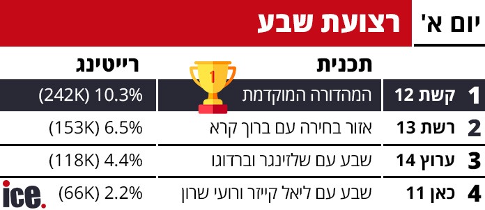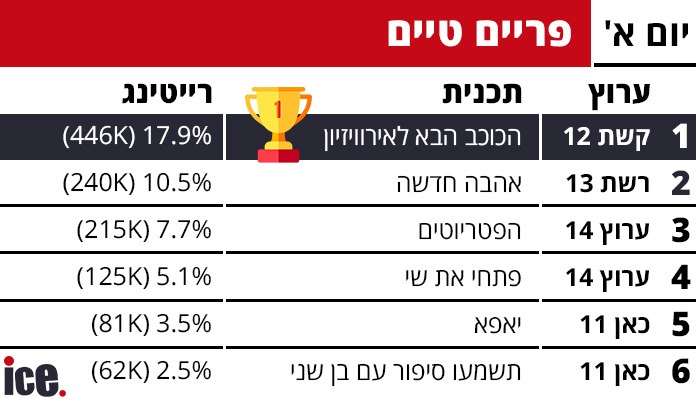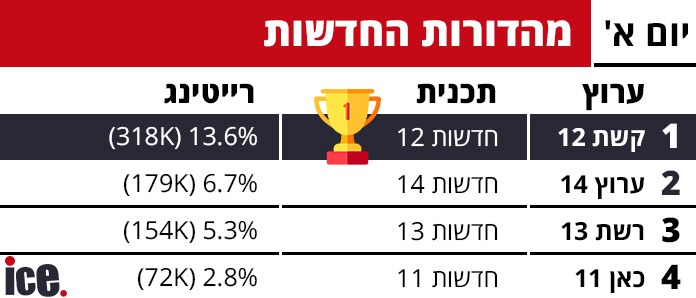 קשת 12 ממשיכה לשלוט בשלט של הציבור הישראלי ומובילה בכלל הרצועות, הפטריוטים אמנם מתחזקים לעומת מוצ"ש אך עדיין מפסידים לפרק הבכורה של אהבה חדשה ברשת 13 ומה ביתר הרצועות?