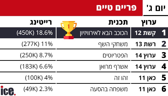 יממה לאחר שאהבה חדשה ניצחה את קשת 12, התהפכו שוב היוצרות והכוכב הבא לאירוויזיון השתלטה על פסגת הפריים טיים, משחקי השף במקום השני והפטריוטים ממשיכים להשתרך באחור, ערוץ 14 מתחזק בשאר הרצועות