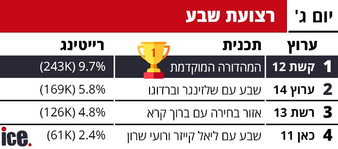 המאבק על השלט של הישראלים בשיאו: יממה לאחר שרשת 13 הפתיעו וניצחו את קשת 12, חזרה הכוכב הבא לאירוויזיון למסכים והחזירה את הבכורה לקשת. ריאליטי המוזיקה השיג נתון מרשים של 18.6% עם מספר של 450 אלף צופים וניצח את משחקי השף ברשת 13 שהשיג נתון של 11% ו-277 אלף צופים. הפטריוטים במקום השלישי עם 8.7% ו-251 אלף צופים.