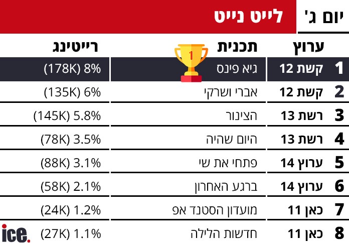 קשת 12 מנצחת גם בגזרת הלייט נייט: גיא פינס עם 8% ו-178 אלף צופים, לפני שם בדוי בערוץ 14 עם נתון של 6.6% ו-185 אלף צופים. הצינור וגיא לרר עם נתון נמוך של 5.8% ו-138 אלף צופים.
