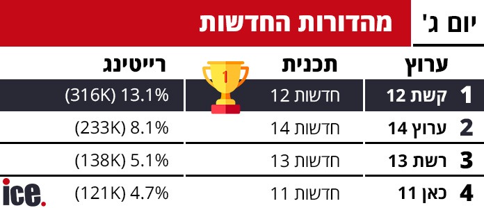 בגזרת החדשות אין חדש תחת השמש: חדשות 12 מובילה את הרייטינג עם 13.1% ו-316 אלף צופים. מהדורת החדשות של ערוץ 14 במקום השני עם 8.1% ו-232 אלף צופים לפני חדשות 13 שממשיך לקבל נתון נמוך של 5.1% ו-138 אלף צופים. כאן 11 ממשיכה להשתרך מאחור.