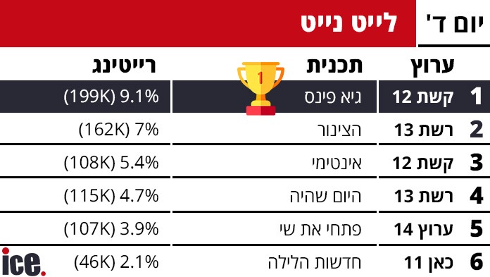 12.רייטינגיאיר גולן 01/2026/10הגב לתגובה זו0 0אצלי בבית רואים רק ערוץ 14סגור