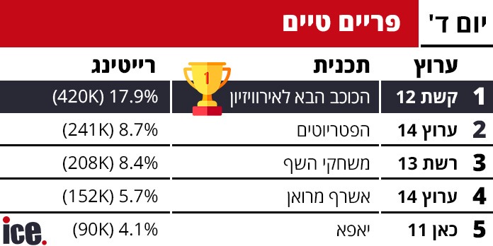 בגזרת הפריים טיים כאמור נרשמה הפתעה גדולה. קשת 12 הובילה עם הכוכב הבא לאירווזיון שזכה ל-17.9% רייטינג (419 אלף צופים), ולמרבה התדהמה, תכנית הפטריוטים של ערוץ 14 זכתה ל-8.7% רייטינג (241 אלף צופים), ובכך עקפה את השידור המתחרה ברשת 13, משחקי השף, שזכה ל-8.4% רייטינג (207 אלף צופים).