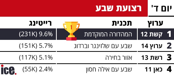 גם ברצועת שבע בערב ערוץ 14 עקף את רשת 13. שבע עם שלזינגר וברדוגו זכה ל-5.7% רייטינג (151 אלף צופים), בעוד שאזור בחירה של רשת 13 זכה ל-5.1% רייטינג (117 אלף צופים).