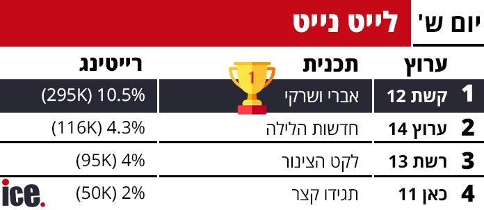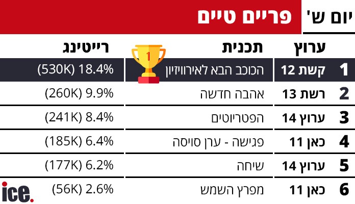 דירוג הרייטינג השבועי של ice: התכנית של "הכוכב הבא לאירוויזיון" רשמה נתון חריג ומרשים של 18.4% רייטינג ו-530 אלף צופים