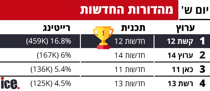 רייטינג: ערוץ 14 וכאן 11 בקרב ראש בראש, "הכוכב הבא" מעל כולם