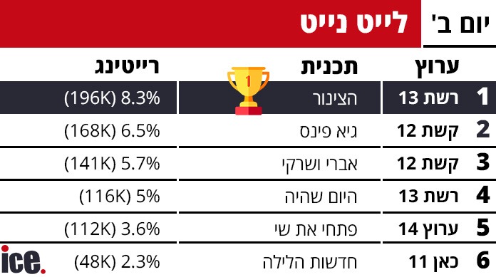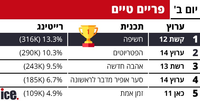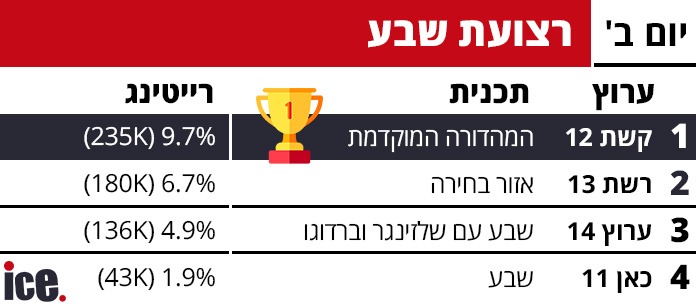 הקרב על השלט של הישראלים נמשך אמש (שני). קשת 12 ממשיכה לשלוט בפסגה ללא עוררין, אך ההפתעה בדירוג הרייטינג היומי של ice היא במקום השני.