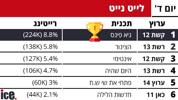 גם בגזרת הלייט נייט 12 ניצחה בגדול. "ערב טוב עם גיא פינס" מנצחת עם 8.8% רייטינג ו-224 אלף צופים, במקום השני, "הצינור" מקדימה במעט את "אינטימי", תוכנית האירוח של רפי רשף ששודרה בערוץ 12. התכנית של גיא לרר רשמה נתון של 5.8% רייטינג ו-138 אלף צופים ואילו "אינטימי" גרפה 5.4% רייטינג ו-127 אלף צופים. "היום שהיה" של רשת 13 עם 4.7% רייטינג ו-106 אלף צופים. פתחי את שי שידור חוזר בערוץ 14 סיים עם 3% ו-60 אלף צופים כאשר חדשות הלילה בכאן 11 סיים עם 2.1% רייטינג ו-44 אלף צופים.
