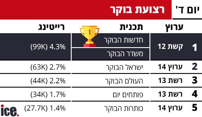 בגזרת רצועות הבוקר, בקשת 12 סיימו את המשדר עם רייטינג של 4.3% ו-99 אלף צופים, כאשר אחריהם נמצא ערוץ 14 עם 2.7% רייטינג ו-63 אלף צופים. שתי התוכניות של רשת 13, "העולם הבוקר" ו-"פותחים יום" מגיעות ל-2.2% ו-44 אלף צופים ו-1.7% ו-34 אלף צופים בהתאמה. כותרות הבוקר של ערוץ 14 נועלת את הטבלה עם 1.4% רייטינג ו-27.7 אלף צופים.
