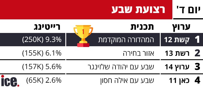 ברצועת 19:00, המהדורה המוקדמת של חדשות 12 רשמה 9.3% רייטינג ו-257 אלף צופים, "אזור בחירה" של ברוך קרא ששדורה ברשת 13 רשמה נתון של 6.1% רייטינג ו-155אלף צופים. מי שנושפת בעורפה היא התכנית "שבע" עם יהודה שלזינגר שגרפה 5.6% רייטינג ו-157 אלף צופים. "שבע" של אילה חסון השיגה 2.6% רייטינג ו-65 אלף צופים.