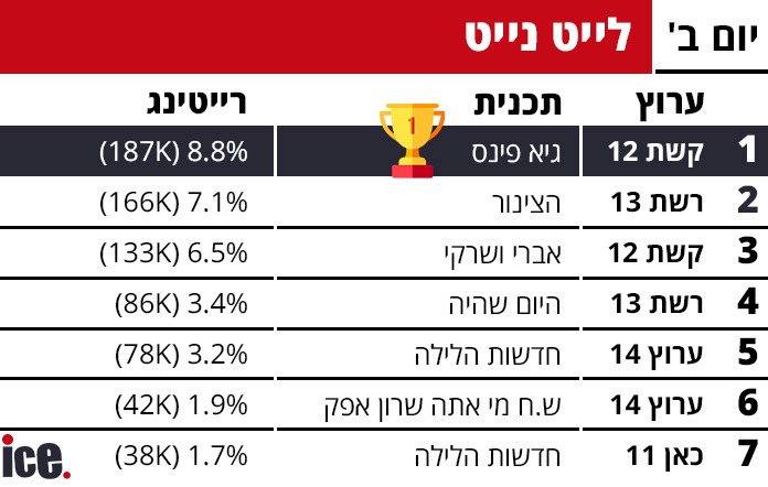 בלייט נייט קשת 12 רשמה ניצחון כשהתוכנית של גיא פינס זכתה ל-8.7% רייטינג ו-186 אלף צופים. הצינור של רשת 13 הגיעה ל-7.1% ו-166 אלף צופים. פתחי את שי בערוץ 14 הגיעו ל-5.1% ו-158 אלף צופים, בעוד שהתוכנית אואזיס במדבר הגיעה למקום האחרון עם 1.4% רייטינג ו-26 אלף צופים.