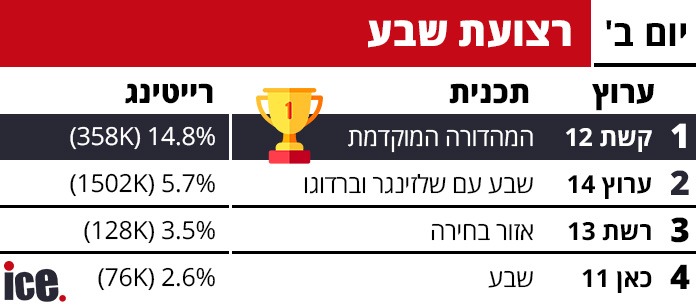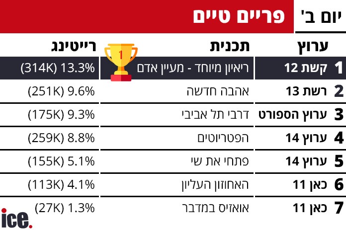 קשת 12 שומרת על העליונות כש"ראיון מיוחד" עם מעיין אדם זכתה ל-13.3%. "הפטריוטים" סיימו עם 8.8%. האם "אהבה חדשה" שוב ניצחה את ערוץ 14?