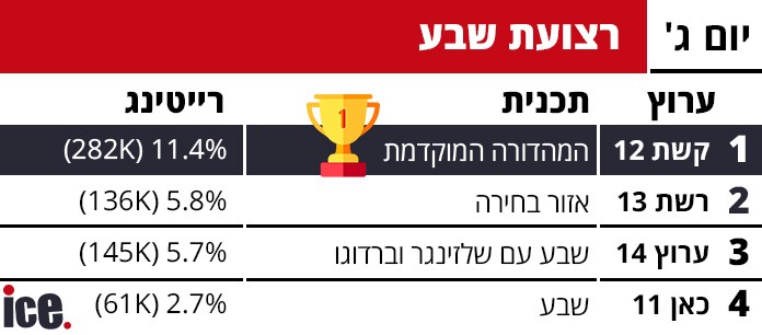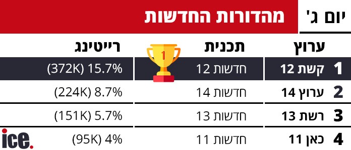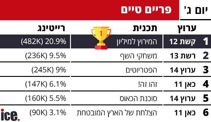 בקרב על הרייטינג בין הערוצים הגדולים בישראל נמשך גם אתמול (שלישי) כאשר בפריים טיים, המירוץ למיליון בקשת 12 ממשיכה להשיג נתונים מטורפים עם 20.9% (482 אלף צופים). אחריה קרב צמוד במיוחד בין משחקי השף ברשת 13, שגרפו 9.5% (236 אלף צופים) לבין הפטריוטים בערוץ 14 עם 9% (245 אלף צופים). זהו זה בכאן 11 גרפה 6.1% (147 אלף צופים).