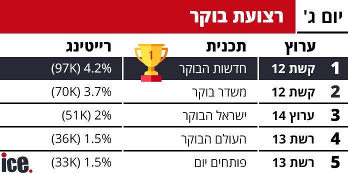 גם בגזרת מהדורות חדשות הבוקר, קשת 12 רושמת ניצחון על המתחרים אחרי שחדשות הבוקר בערוץ השיגה 4.2%. אחרי ישראל הבוקר בערוץ 14 עם 2% ובמקום האחרון בגזרה העולם הבוקר ברשת 13 עם 1.5%.