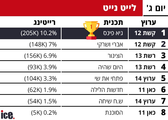 בגזרת הלייט נייט, קשת 12 רושמת ניצחונות גדולים כאשר ערב טוב עם גיא פינס השיגה 10.2% (205 אלף צופים) ואברי ושרקי עם 7% (148 אלף צופים). הצינור ברשת 13 עם 6.9% (156 אלף צופים) והיום שהיה גם כן ברשת עם 3.9% (93 אלף צופים). פתחי את שי בערוץ 14 גרפו 3.3% ובמקום האחרון חדשות הלילה בכאן 11 עם 1.9% (62 אלף צופים).