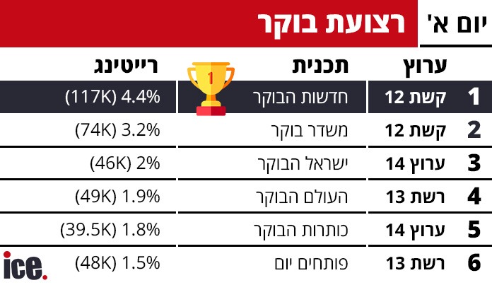 בגזרת תכניות הבוקר: במקום הראשון חדשות הבוקר של ערוץ 12 שרשמו 4.4% רייטינג שהם כ-117 אלף צופים. במקום השני ישראל הבוקר של ערוץ 14 שרשמו 2% שהם כ-46 אלף צופים. במקום השלישי, העולם הבוקר של ערוץ 13 שרשמו, 1.9% רייטינג שהם כ-49 אלף צופים.