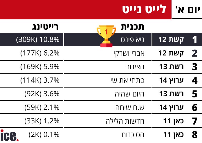 במסגרת תכניות הלייט נייט: במקום הראשון גיא פינס וקשת 12 רשמו 10.8% רייטינג שהם כ-309 אלף צופים. במקום השני שוב קשת 12 הפעם עם אברי ושרקי שרשמו 6.2% רייטינג שהם כ-177 אלף צופים. במקום השלישי הצינור של רשת 13 שרשמו 5.9% רייטינג שהם כ-169 אלף צופים. במקום הרביעי ערוץ 14 עם פתחי ושי שרשמו3.7% רייטינג שהם כ-114 אלף צופים.