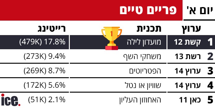 רייטינג יומי: "מועדון לילה" מרסקת את המתחרות עם 17.8% רייטינג שהם כ-480 אלף צופים. "משחקי השף" ו-"הפטריוטים" בתחרות צמודה