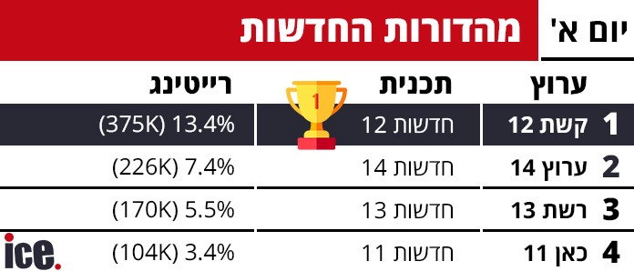 בגזרת מהדורות החדשות: במקום הראשון מהדורת החדשות של ערוץ 12, חדשות 12 שרשמו 13.4% רייטינג שהם כ-375 אלף צופים. במקום השני מהדורת החדשות של ערוץ 14, חדשות 14 שרשמו 7.4% רייטינג שהם כ-225 אלף צופים. במקום השלישי מהדורת החדשות של ערוץ 13, חדשות 13 שרשמו5.5% רייטינג שהם כ-170 אלף צופים. במקום החמישי מהדורת החדשות של כאן 11, חדשות 11, שרשמו 3.4% רייטינג שהם כ-104 אלף צופים.