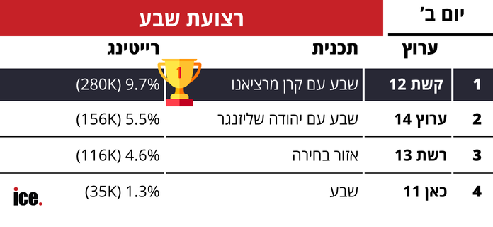 ברצועת 19:00, התכנית החדשה של הרצועה "שבע" עם קרן מרציאנו השיגה נתון של 9.7% רייטינג ו-280 אלף צופים, "שבע" של יהודה שלזינגר עם 5.5% ו-156 אלף צופים. מי שנשארת מאחור היא "אזור בחירה" שהשיגה רק 4.6% רייטינג ו-116 אלף צופים וסוגרת את הרשימה היא "שבע" של כאן 11 עם 1.3% רייטינג ו-35 אלף צופים בלבד.