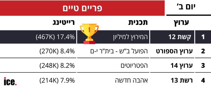 רייטינג: "המירוץ למיליון" מתפוצצת, ערוץ 14 ביום חזק